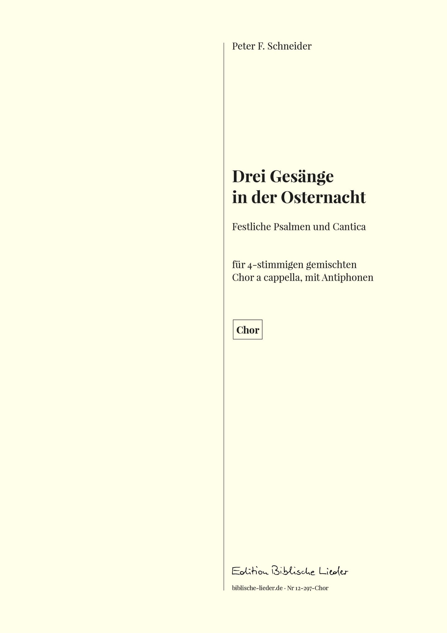 Die »Drei Gesänge für die Osternacht« sind eine Auftragskomposition der Musikstiftung St. Michael München und wurden Ostern 2018 vom Kammerchor St. Michael unter der Leitung von Frank Höndgen uraufgeführt. Die Texte entstammen der Liturgie der Osternacht, vertont als Chormotetten a cappella, in einer festlichen Form auf die alttestamentlichen Lesungen antwortend:
